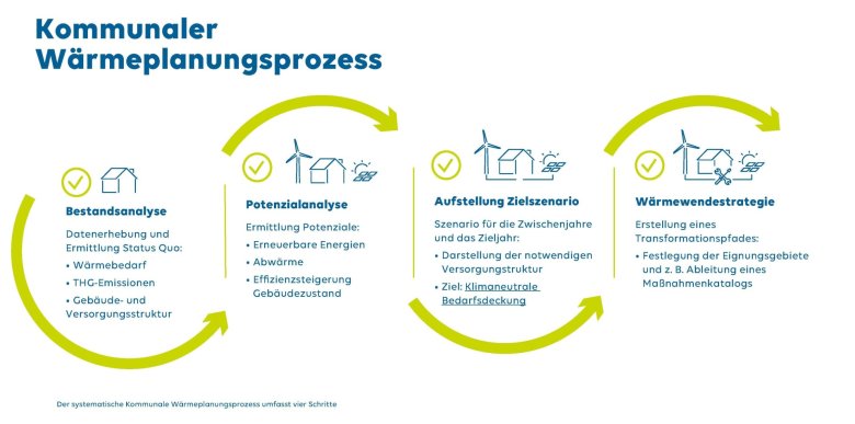Im ersten Schritt wird eine umfangreiche Datenerhebung durchgeführt. Hierzu wird die Verwaltung intensiv mit dem lokalen Energieversorger zusammenarbeiten, um Energieverbrauchsdaten von Fernwärme, Gas und Strom für die Kommunale Wärmeplanung nutzen zu können (Bestandsanalyse). Im Rahmen der Kommunalen Wärmeplanung wird der Wärmebedarf der Ortsteile ermittelt, die Verfügbarkeit erneuerbarer Wärmequellen geprüft und der Ausbau von Wärmenetzen sowie dezentrale Lösungen wie Wärmepumpen bewertet (Potenzialanalyse). Zunächst werden Daten zu Gebäuden, Energieträgern und Abwärmepotenzialen gesammelt. Danach werden die wirtschaftlichsten Lösungen für die Wärmeversorgung bestimmt und das Gemeindegebiet in Zonen wie Wärmenetzgebiete, Wasserstoffnetze, dezentrale Versorgungsgebiete oder Prüfgebiete unterteilt (Zielszenario). Abgerundet wird der Wärmeplan mit einem Umsetzungskonzept, in dem konkrete Maßnahmenvorschläge zur Zielerreichung dargestellt werden (Wärmewendestrategie).