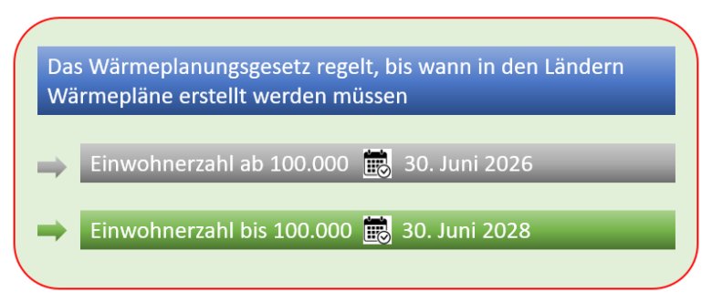 Das Wärmeplanungsgesetz legt die rechtliche Grundlage für die verbindliche und flächendeckende Einführung der Wärmeplanung fest. Für Gemeinden mit mehr als 100.000 Einwohnern muss der Wärmeplan bis Juni 2026 erstellt werden. In Gemeinden mit bis zu 100.000 Einwohnern ist die Frist dafür der 30. Juni 2028.