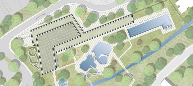 Die Freianlagen führen diese Ordnung fort. Ein neu gestalteter Eingangsplatz bildet die Adresse des Bades. Das Freibad erhält Terrassen, Liegewiesen, Spiel- und Sportflächen. Verkehr und Anlieferung bleiben im Westen funktional getrennt – der Außenraum gehört den Gästen.